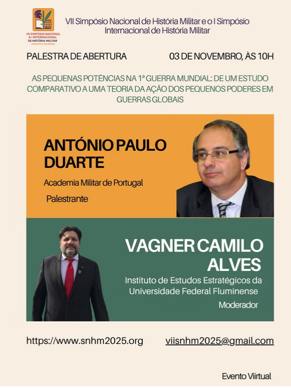 Na próxima semana terá início o VII Simpósio Nacional de História Militar e o I Simpósio Internacional de História Militar, organizado pelo INEST e pela Universidade Salgado de Oliveira, com o apoio da Rede Hermes da ANPUH. Realizado entre os dias 3 e 6 de novembro de 2025, Simpósio apresenta o tema Violência e Sociedade: Perspectivas de análises no contexto de novos caminhos e novas abordagens. As apresentações serão em modo presencial e remoto. A programação pode ser vista em https://www.snhm2025.org/