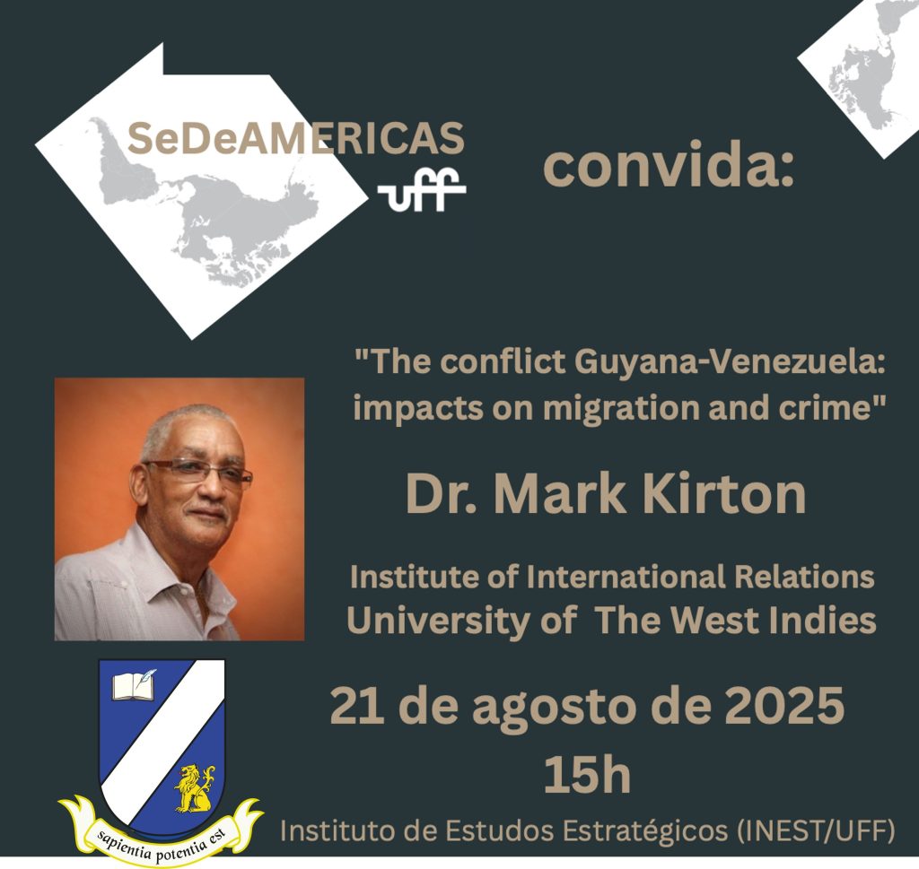 O grupo de pesquisa Segurança e Defesa nas Américas (SeDeAMERICAS), do INEST/UFF recebe nesta quinta, 21/08, o Prof. Dr. Mark Kirton, do Instituto de Relações Internacionais da Universidade das Índias Ocidentais (Trinidad e Tobago).